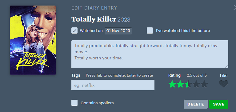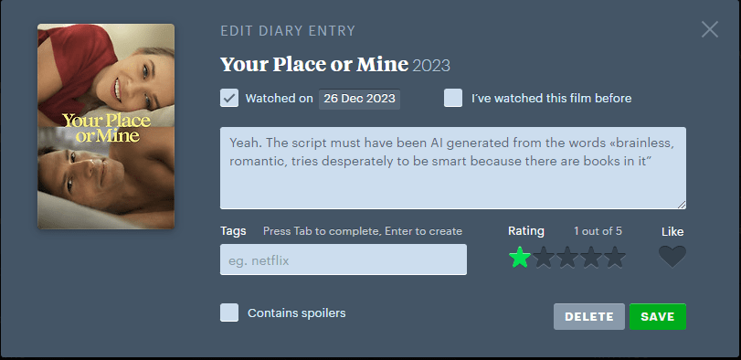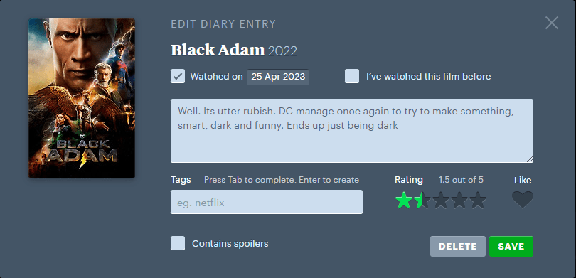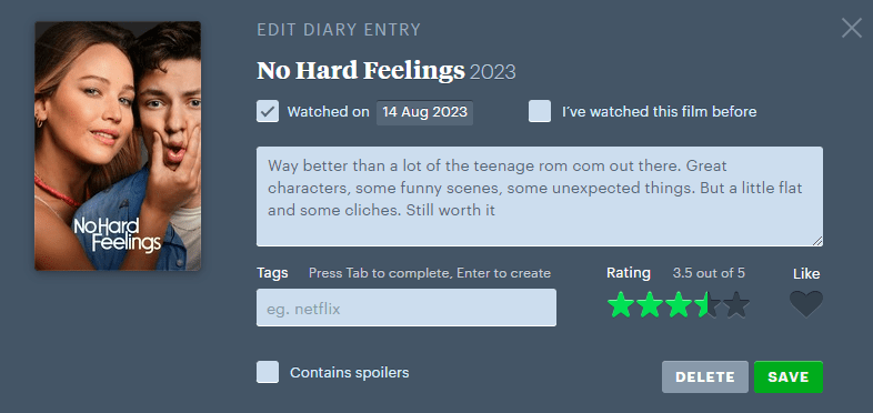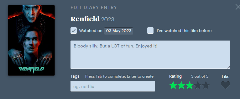 Jeg hadde en bra dag. Lo høyt. Elsket mange av scenene. Og helt til slutt hadde Letterboxd lagt inn en liten feature/easter egg for alle som vurderte filmen. Jeg ble helt vill i trusa og sa «Fuck it. Dette er dritkult». Fem blank der. (Sjekk videoen under)