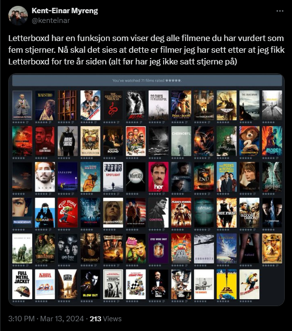 Denne teksten følte jeg derfor at jeg måtte skrive på grunn av en tweet jeg nettopp delte med oversikt over alle 5er-filmene jeg har vurdert på Letterboxd.